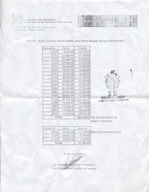 La Secretaría de Salud de Veracruz no ha tomado en cuenta el adeudo que tiene con la empresa “Prax-Air” que surtía de oxigeno al hospital de Coatepec, para que la Secretaría de Finanzas y Planeación le pague de acuerdo a lo ordenado por el Gobernador Javier Duarte de Ochoa.