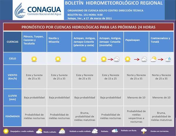 La interacción entre un canal de baja presión (CB) que se localiza sobre el centro de los Estados Unidos y Norte de México con un sistema de alta presión (A) que se extiende al golfo de México, mantiene la entrada de aire marítimo tropical con ligero a moderado contenido de humedad hacia la vertiente oriental del país, la cual a su vez ocasiona en la mayor parte de la región cielo despejado a medio nublado, excepto en la zona Sur donde Se observan algunos nublados.