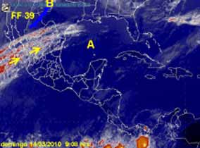Le entrada de aire marítimo tropical con escaso contenido de humedad hacia la vertiente oriental del país, ocasiona en la región cielo despejado a medio nublado. La corriente de vientos máximos comienza a activarse nuevamente y transporta nubosidad alta hacia el interior de la República mexicana. Un sistema de baja presión se localiza sobre el Suroeste de los Estados Unidos, desde donde se desprende el frente frío No. 38 (FF38) hasta el Noroeste de México.