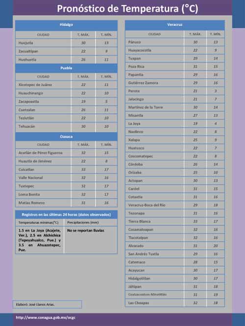 La entrada de aire marítimo tropical con bajo contenido de humedad hacia la vertiente oriental del país, ocasionara en la región cielo despejado a medio nublado y temperatura alta hasta el día lunes. Un canal de baja presión tenderá a desarrollarse sobre el Oeste del Golfo de México la tarde del lunes, lo que ocasionará que el viento se fije al Norte y Noreste con velocidades moderadas. El frente frío No. 39 podría ubicarse la tarde del lunes sobre el Noreste de México. Por su parte el sistema de alta presión y masa de aire frío que se le asocia tenderá a cubrir el Centro y Sur de los Estados Unidos.