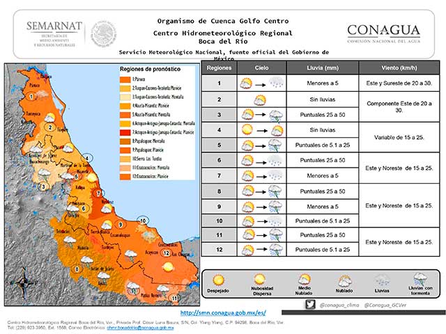El avance hacia el oeste de la Onda Tropical número 21 sobre la región Ístmica de Tehuantepec, sobre y al sur del país apoyará un ligero fortalecimiento de una vaguada en el suroeste del Golfo de México para mantener en las siguientes 24 a 48 horas la incidencia del flujo cálido y húmedo hacia el estado de Veracruz donde se prevén registros de temperatura diurna alta con sensaciones térmicas elevadas, sin embargo, producto del ascenso forzado de la humedad posterior al máximo calentamiento diurno podrían favorecer el desarrollo de nublados con potencial para lluvias-chubascos aislados, sin descartar, actividad eléctrica y caída de granizo en horas de la tarde-noche sobre regiones de montaña y porción sur de Veracruz. Finalmente, se prevé que ambas condiciones podrían persistir hacia el fin de semana por lo que se recomienda mantenerse informados y tomar las precauciones pertinentes.