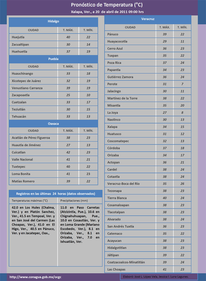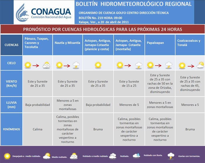 Se espera que el evento de «Surada» en la zona de Orizaba tienda a disminuir durante este día, efecto que mantendrá cielo despejado a medio nublado así como temperatura diurna sensiblemente alta en gran parte de la región; por su parte, en zonas montañosas continúa previéndose algunas lluvias con posibles tormentas y cierta posibilidad de granizadas durante la tarde o noche, como resultado del calentamiento diurno y a un moderado contenido de humedad en la región.