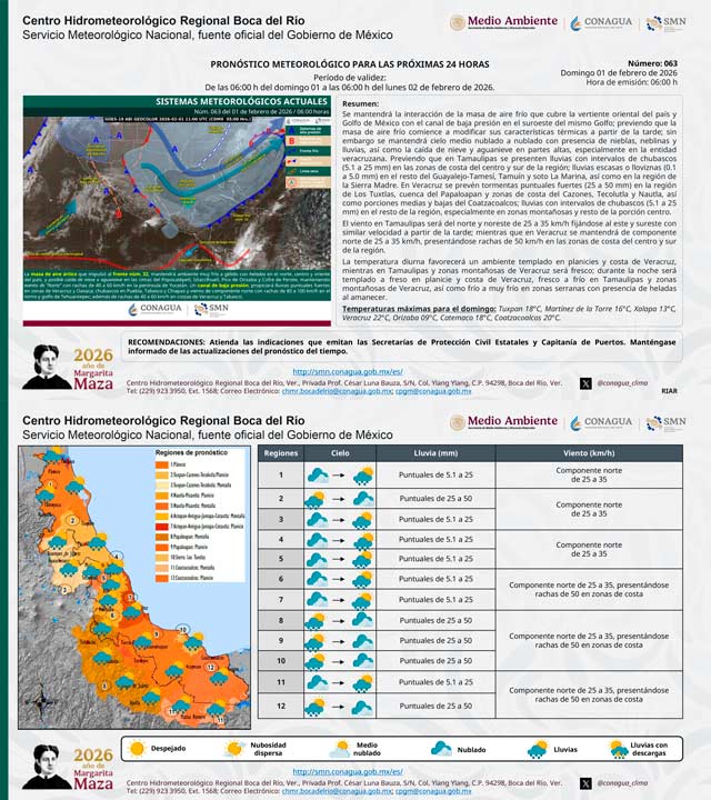 Se mantendrá la interacción de la masa de aire frío que cubre la vertiente oriental del País y Golfo de México con el canal de baja presión en el suroeste del mismo Golfo; previendo que la masa de aire frío comience a modificar sus características térmicas a partir de la tarde; sin embargo se mantendrá cielo medio nublado a nublado con presencia de nieblas, neblinas y lluvias, así como la caída de nieve y aguanieve en partes altas, especialmente en la entidad veracruzana.