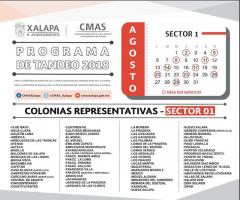 Al respecto, dijo que el calendario de tandeo para agosto en la ciudad se encuentra disponible para consulta y descarga de los usuarios en www.cmasxalapa.gob.mx y en las cuentas oficiales de Twitter y Facebook.
