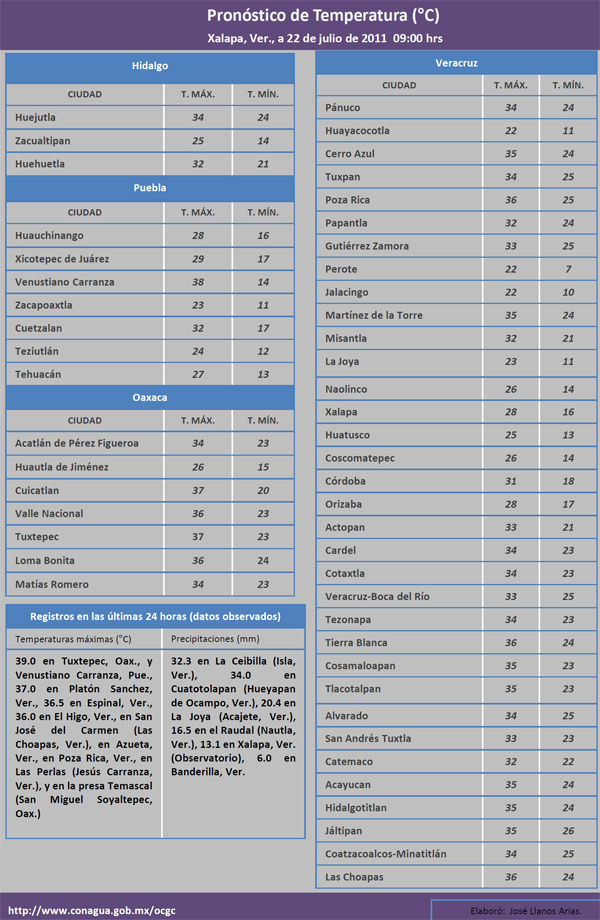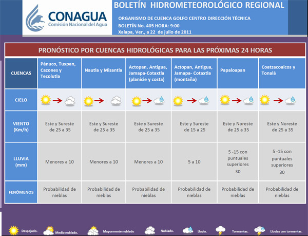 La entrada de aire marítimo tropical con ligero a moderado contenido de humedad hacia la vertiente oriental del país, continuará ocasionando en la región temperatura relativamente alta hasta la semana que entra. Asimismo mantendrá la probabilidad de lluvias aisladas durante la tarde o noche en zonas montañosas y entre la noche y madrugada en la costa, las condiciones para lluvias podrían aumentar hacia la tarde del sábado cuando se aproxime la onda tropical No. 11 al Sur de Veracruz.
