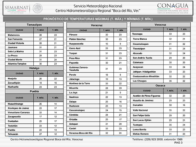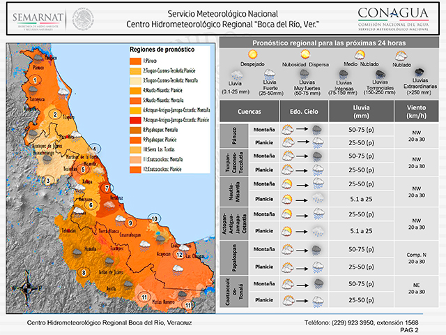 En el resto de esta mañana y de la noche de hoy a la mañana del domingo continuará el desarrollo de chubascos con tormentas puntuales fuertes (25 a 50 mm) sobre la costa norte y sur de la entidad veracruzana, mientras que hacia la porción centro se prevén acumulados de 5.1 a 25 mm, esto ocasionado por la presencia del Frente Frío número 2 y un canal de baja presión al suroeste del Golfo de México. Por otro lado, estos mismos sistemas y el forzamiento orográfico generarán lluvias vespertinas a nocturnas en zonas de montaña previéndose chubascos fuertes con tormentas muy fuertes (50 a 75 mm) sobre las partes altas de las cuencas de los ríos Pánuco, Tuxpan, Cazones, Tecolutla, Nautla, Misantla, Actopan, Papaloapan, Coatzacoalcos y Tonalá, en el resto de las zonas montañosas habrá chubascos con tormentas puntuales fuertes (25 a 50 mm). El viento oscilará en la componente Norte de 25 a 35 km/h. Los valores de temperatura disminuirán ligeramente, sin embargo se mantendrá el ambiente diurno caluroso en la costa y templado en partes serranas y de montaña.