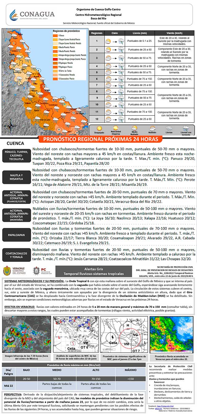 El eje de la onda tropical número 6 se ubica esta mañana frente a las costas de Veracruz, favoreciendo condiciones muy inestables con lluvias y tormentas fuertes de 20-40 milímetros, puntuales de 70-100 milímetros o mayores sobre cuencas del Pánuco al Papaloapan en sus límites con los estados vecinos.