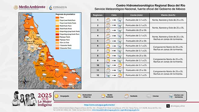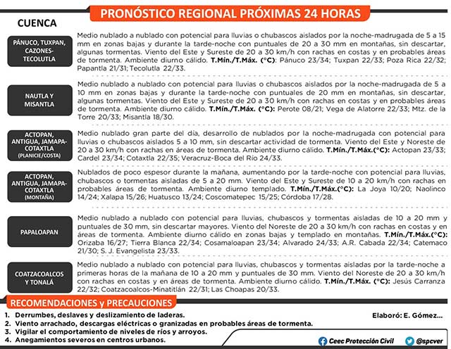 Modelos de pronóstico indican que en los siguientes días dominarán condiciones del tiempo típicas de la temporada: se esperan lluvias, chubascos y tormentas aisladas en Veracruz, las de mayor importancia sobre regiones de montaña y zona sur, esta situación, favorecida por la persistencia de una vaguada en el oeste-suroeste del Golfo de México y la llegada de ondas tropicales. El viento del sureste, este y noreste moderado en costas y el ambiente diurno cálido, principalmente en las llanuras-costas.