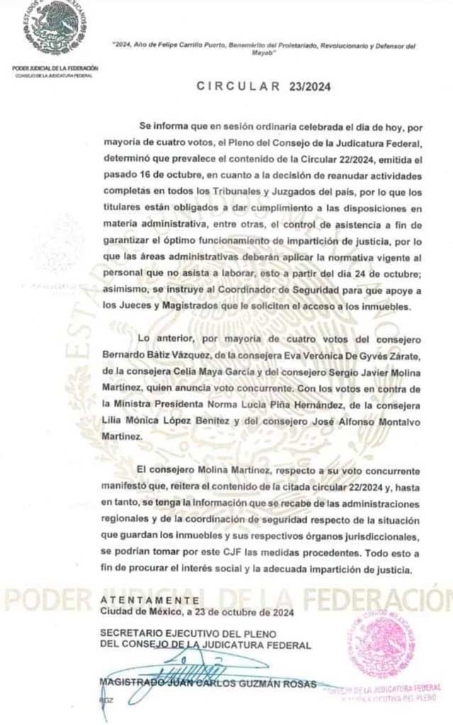 Aunque el Consejo de la Judicatura Federal (CJF) había ordenado la reanudación de actividades el pasado jueves, integrantes de la JUFED decidieron por voluntad propia regresar en distintas fechas pues cada Circuito de Distrito tomó sus propias decisiones. En un comunicado, esta asociación aclaró que la medida fue tomada “en beneficio de la población”; sin embargo, advirtieron que mantendrán métodos legítimos de protesta y no descartaron un nuevo paro si el CJF no responde a sus demandas.