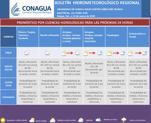 El frente frío No. 38 (FF38) se localiza sobre el centro de Veracruz. Por su parte el sistema de alta presión y masa de aire frío que se le asocia invade el Noroeste del Golfo de México. Estos sistemas están ocasionando que aumenten los nublados y se fije el viento al Norte con velocidades fuertes que en el puerto de Veracruz alcanzan rachas de 65 km/h. La corriente de vientos máximos, medios y altos hacia el interior del país