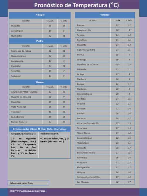 Se espera que el frente frío No. 38 recorra durante este día la vertiente oriental del país y se alejará de México entre esta noche a mañana. Por su parte el sistema de alta presión y masa de aire frío que se le asocia cubrirá el Golfo de México. Ambos sistemas ocasionarán que aumenten los nublados con cierta probabilidad de lluvias vespertinas, ligera disminución de la temperatura y en la costa viento del Norte de 40 a 50 km/h con rachas de 65 km/h, el cual disminuirá hacia esta tarde.