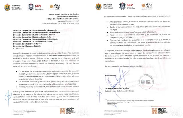 Por medio de la circular SEV/SEB/6C/2024, la Subsecretaria de Educación Básica Maritza Ramírez Aguilar confirmó el inicio de dicha medida para evitar la exposición de los y las estudiantes a las bajas temperaturas de la mañana y de la tarde-noche. Dicha acción entró en vigor el pasado 10 de enero y finalizará el 28 de febrero próximo y su aplicación queda a elección de cada Comité de Padres de Familia y de cada Consejo Técnico Escolar.