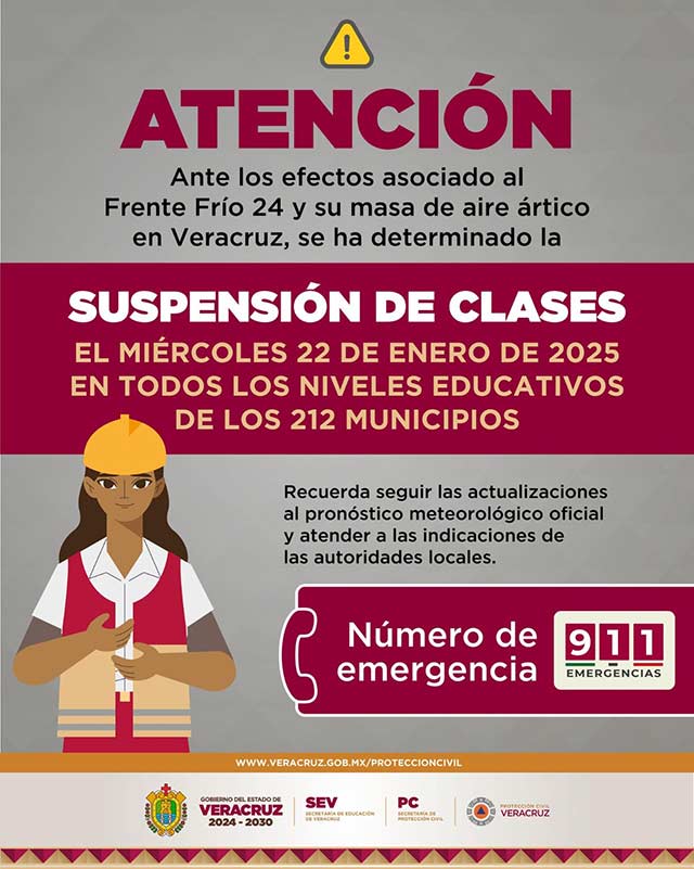 La Secretaría de Educación de Veracruz (SEV) confirmó la suspensión de clases de manera generalizada en todo el Estado, en todos los niveles educativos.