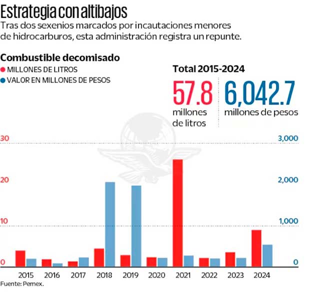 Fue hasta 2024, año compartido por el gobierno pasado y la actual administración, que el decomiso subió a 8.9 millones de litros de combustible y aditivos.