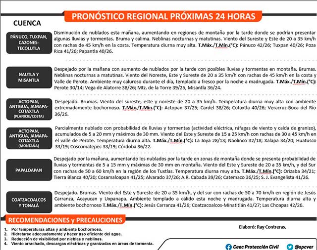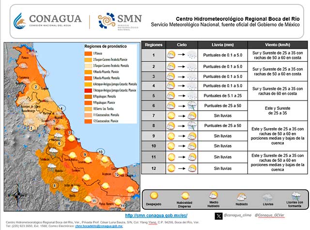 El viento será del Sur y Sureste de 25 a 35 km/h a lo largo de la región de pronóstico, presentándose rachas de 50 a 60 km/h en Tamaulipas, así como en Veracruz en las zonas de costa de la porción norte y porciones medias y bajas de las cuencas del Papaloapan y Coatzacoalcos.