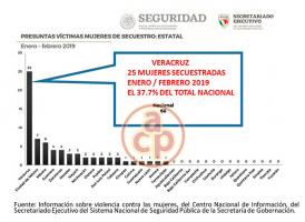 De las 68 mujeres secuestradas en la República Mexicana en los meses de enero y febrero del año en curso, 25 de ellas, (el 36.7% del total), fueron privadas de su libertad en la entidad veracruzana, por lo que Veracruz sigue siendo el primero del país en este tipo de delito, de acuerdo a datos del Secretariado Ejecutivo del Sistema Nacional de Seguridad Pública (SESNSP), de la Secretaría de Gobernación (SEGOB).