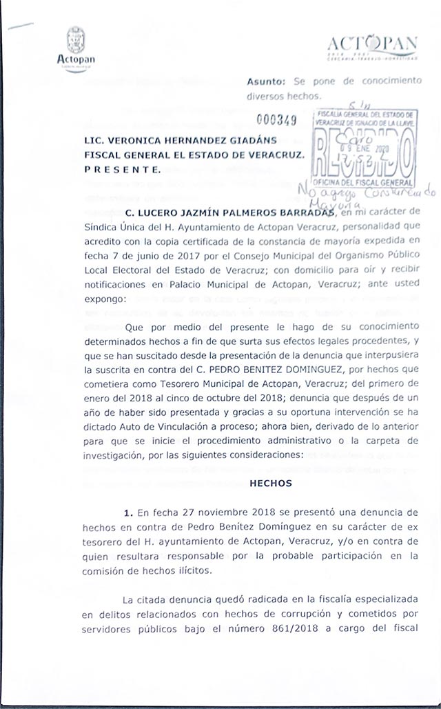 A través de un oficio que presentó este jueves a la encargada de la Fiscalía General del Estado de Veracruz, Verónica Hernández Giadáns, la síndica del Ayuntamiento de Actopan, Lucero Jazmín Palmeros Barradas, denuncia que el fiscal anticorrupción, José Alfredo Corona Lizárraga, encabeza una “red de protección” a favor del extesorero de ese municipio, Pedro Benítez Domínguez.