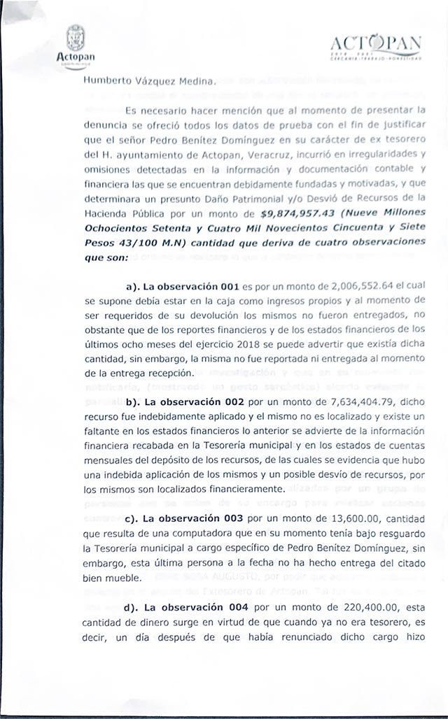 En la relatoría de hechos, la Síndica de Actopan muestra las pruebas de las irregularidades encontradas en el periodo en que fue Tesorero de Actopan Pedro "N" y las dificultades que han encontrado desde que interpusieron la denuncia hace poco más de un año.