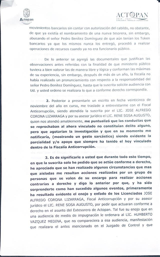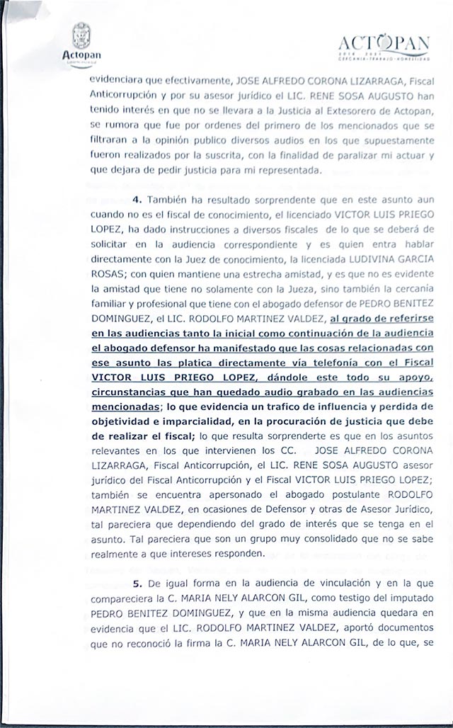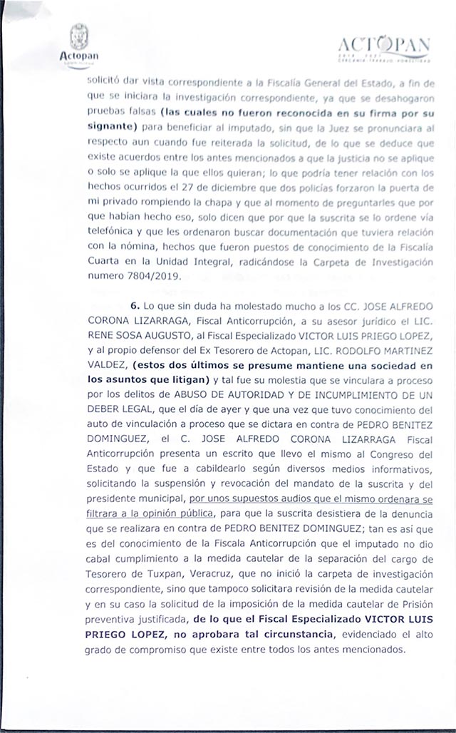 Añade que “lo que sin duda ha molestado mucho a los ciudadanos Alfredo Corona Lizárraga, fiscal anticorrupción, a su asesor jurídico el licenciado René Sosa Augusto; al fiscal especializado Víctor Luis Priego López y al propio defensor del extesorero de Actopan, Rodolfo Martínez Valdés, (estos dos últimos se presume mantienen una sociedad en los asuntos que litigan) y tal fue su molestia que se vinculara a proceso por los delitos de ABUSO DE AUTORIDAD Y DE INCUMPLIMIENTO DE UN DEBER LEGAL, que el día de ayer y que una vez que tuvo conocimiento del auto de vinculación a proceso que se dictara en contra de Pedro "N", José Alfredo Corona Lizárraga, fiscal anticorrupción, presenta un escrito que llevó él mismo al Congreso del Estado y que fue a cabildearlo según diversos medios informativos, solicitando la suspensión y revocación del mandato de la suscrita y del Presidente Municipal, por unos supuestos audios que él mismo ordenara se filtraran a la opinión pública, para que la suscrita desistiera de la denuncia que se realizara en contra de Pedro "N"”.