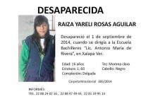 Pido amablemente su apoyo para la difusión a toda la ciudadanía de la desaparición de la joven Raiza Yareli Rosas Aguilar, de 16 años de edad, estatura 1.60, complexión delgada, tez morena clara, cabello negro; quien desapareció el día lunes 1 de septiembre al rededor de las 6 de la mañana, carpeta ministerial 305/2014.