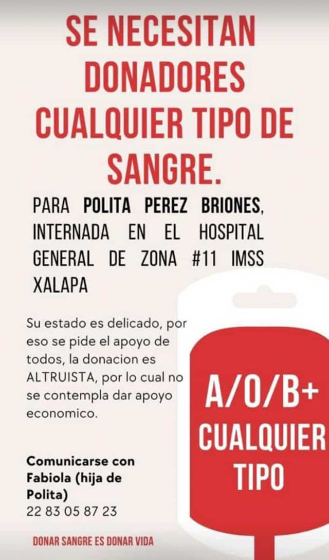 Solicitan donadores de sangre para paciente de la clínica 11 del IMSS, en Xalapa
