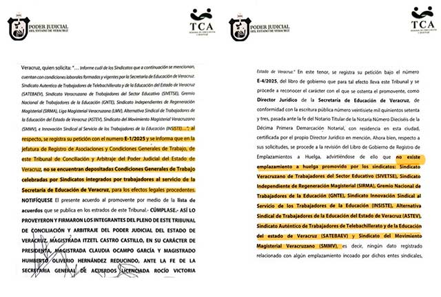 Además, el Tribunal de Conciliación y Arbitraje determinó que no existe emplazamiento a huelga promovido por los sindicatos que mantienen bloqueadas las oficinas centrales de la SEV y algunas otras dependencias de la institución en la capital veracruzana, por lo que estas organizaciones se encuentran actuando fuera de la ley.