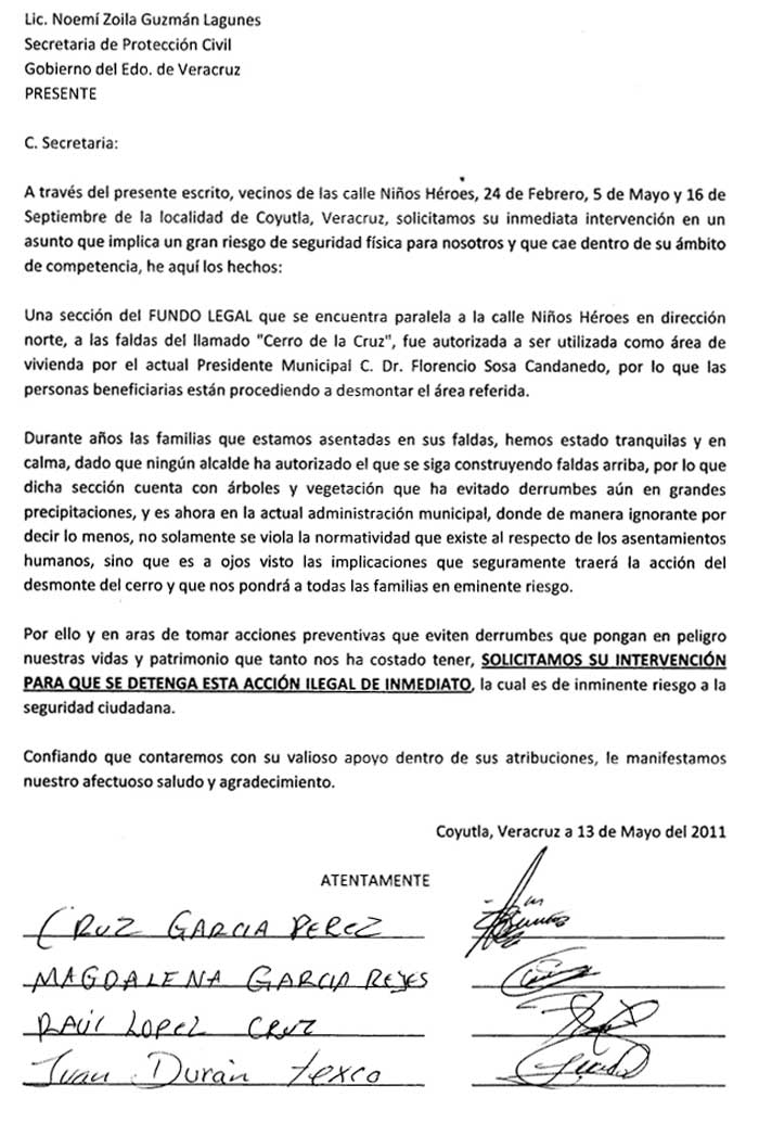 Como su prestigiado medio es leído no solamente por la ciudadanía veracruzana sino también por sus autoridades, le agradeceríamos profundamente que nos hiciese el favor de publicar una URGENTE SOLICITUD DE ATENCIÓN dirigida a la titular de la Secretaría de Protección Civil del Estado y con copias de atención al C. Gobernador y a otros funcionarios y al mismo presidente municipal de Coyutla Dr. Florencio Sosa Candanedo.