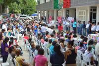 Luego del término de los honores a los símbolos patrios, el presidente Ricardo Serna Barajas se reunió con mujeres que acudieron a la explanada, con la finalidad de inscribirse en los talleres administrados por el Desarrollo Integral de la Familia.