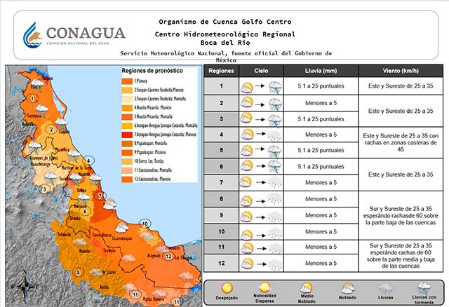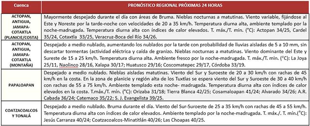 En el Estado de Veracruz dominará el ambiente caluroso con sensación térmica elevada en regiones de costa y llanura. Además, se espera que el evento de surada alcance rachas de 50 a 70 kilómetros por hora en el Valle de Perote, Orizaba, Los Tuxtlas, Acayucan-Jesús Carranza y extendiéndose a la costa norte, este tipo de ambiente es de riesgo para el desarrollo de incendios forestales, de pastizales y basureros.
