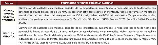 Se espera un ambiente caluroso con sensación térmica elevada en regiones costeras y de llanura, apoyado además por un evento de surada con rachas fuertes. Por la tarde-noche, las lluvias se concentrarían en porciones del norte y regiones de montaña del centro de Veracruz. Evite acciones que puedan generar incendios forestales, de pastizales y basureros. Consulte la actualización de este pronóstico.