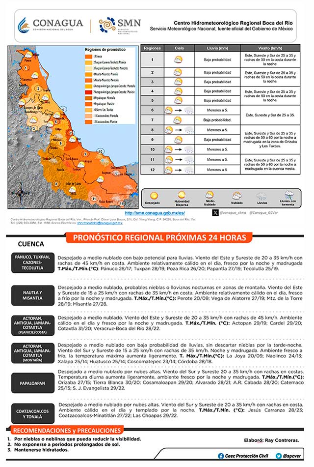 Domingo 16: Surada de 30 a 50 kilómetros por hora en la costa norte, el valle de Perote, región de Orizaba, Los Tuxtlas y entre Jesús Carranza-Acayucan, decreciendo conforme avance la mañana, dando paso al desarrollo de otro evento de “norte” con rachas de 70 a 85 kilómetros por hora en las costas centro y sur y de 55 a 70 kilómetros por hora en la costa norte. Aumenta el potencial de lluvias y tormentas con acumulados de 5 a 20 milímetros en promedio en el estado y máximos de 30 a 50 milímetros entre las cuencas del Tecolutla al Colipa y Papaloapan al Tonalá, siendo probables mayores a este rango de forma más dispersa. Oleaje de 1.0 a 3.0 metros. La temperatura máxima disminuye ligeramente en comparación al día de ayer.