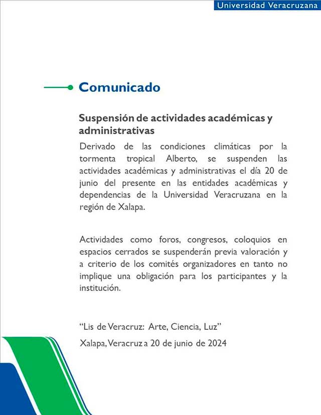 Este jueves, la Universidad Veracruza (UV) anunció que a causa de las condiciones climáticas que trajo la tormenta tropical “Alberto” las actividades administrativas y académicas se suspenden este jueves en la región Xalapa. Sólo deja a criterio de los comités organizadores la cancelación de foros, congresos y coloquios en espacios cerrados
