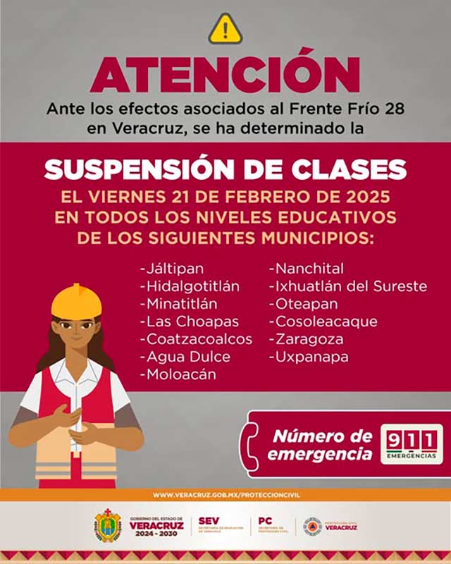 Debido a las lluvias que provocará el Frente Frío 28 y el incremento en ríos, se suspenderán clases en 13 municipios del sur de Veracruz, informó la SEV. La medida es para Jáltipan, Hidalgotitlán, Minatitlán, Las Choapas. Coatzacoalcos, Agua Dulce, Moloacán, Nanchital, Ixhuatlán del Sureste, Oteapan, Cosoleacaque, Zaragoza y Uxpanapa.