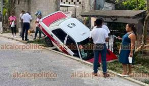 Taxi cae “de cabeza” y casi se mete a vivienda, en Papantla