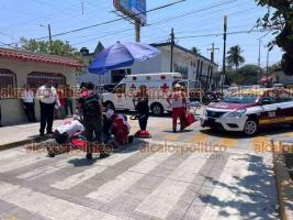 Una mujer que viajaba como acompañante en una motocicleta conducida por su hijo terminó hospitalizada, luego de que el conductor de un taxi los impactara en calles de la colonia Nueva Era, en el municipio de Boca del Río.