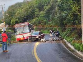 Según el parte, el conductor del taxi Nissan Versa, blanco con rojo y con número económico 6 de Zongolica, invadió el carril contrario para rebasar a un autobús de pasaje de la Línea Adelas.