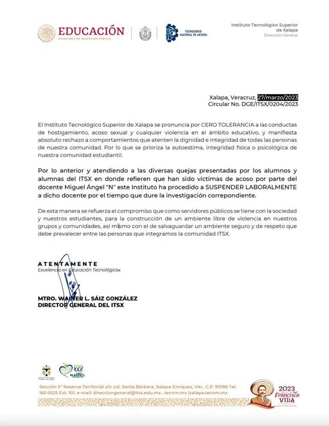 Por lo anterior y atendiendo a las diversas quejas presentadas por los alumnos y alumnas del ITSX, donde refieren que han sido víctimas de acoso por parte del docente Miguel Ángel "N", este Instituto ha procedido a SUSPENDER LABORALMENTE a dicho docente por el tiempo que dure la investigación correspondiente.