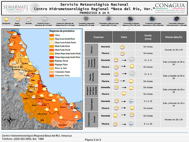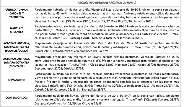Durante este miércoles prevalecerán las condiciones de tiempo estable en gran parte de Veracruz, con cielo parcialmente nublado con un ambiente templado a ligeramente cálido y sin lluvias significativas, situación originada por el dominio de un sistema anticiclónico sobre la vertiente oriental del país y Golfo de México cuya circulación puede ocasionar algunas rachas del sureste mayores a 45 km/h en regiones de Tuxpan-Tecolutla. Por la noche y madrugada continuará el ambiente fresco a frío especialmente en regiones montañosas con posibles heladas al amanecer en el Valle de Perote, faldas del Pico de Orizaba y Huayacocotla.