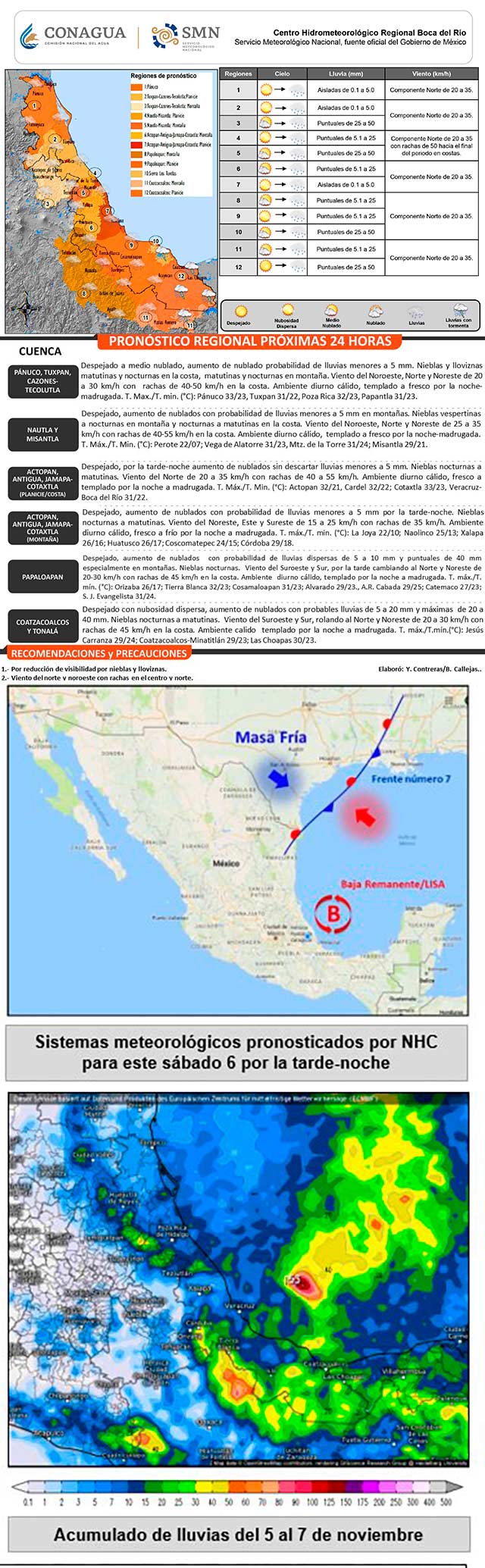 Lisa se ha degradado en una baja remanente en el suroeste del Golfo de México, localizada a 245 kilómetros al nor-noreste de Veracruz, vientos máximos sostenidos de 35 kilómetros por hora, presión de 1008 mb; además el frente frío número 7 se extiende desde una baja presión ubicada al norte de Missouri, Estados Unidos, hasta el noreste del país.
