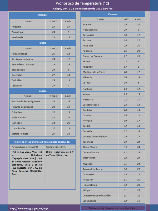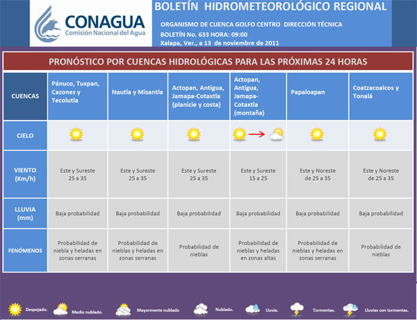 Por otra parte, sigue observándose que hacia la tarde del miércoles un frente frío y el sistema de alta presión y masa de masa de aire frío que se le asocia afecten a la región con aumento del potencial de lluvias, las cuales nuevamente podrían ser de mayor importancia en las zonas de Martínez-Misantla, costa central y Sur, asimismo se tendría un nuevo descenso de la temperatura diurna, viento del Norte fresco a fuerte y oleaje elevado.