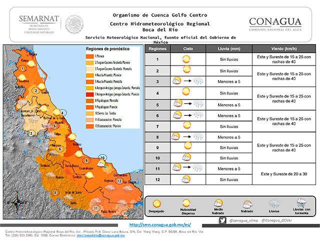 La circulación del sistema de alta presión en el Golfo de México mantendrá las condiciones estables en el estado de Veracruz con periodos de sol importantes, recuperación de la temperatura diurna y limitado potencial de lluvias, aunque no se descarta la presencia de nieblas y neblinas vespertinas a nocturnas en zonas serranas y matutinas en la costa. El viento por su parte es del Este y Sureste con velocidades moderadas en la costa.