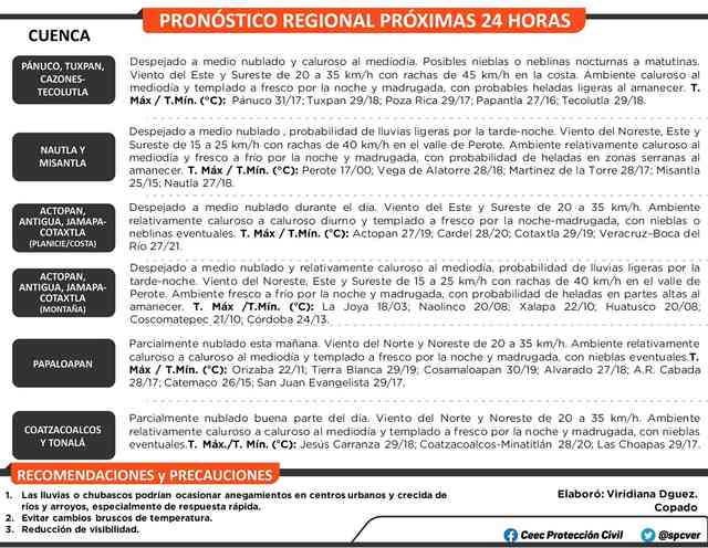 Tiempo relativamente estable para este día. Ambiente relativamente caluroso a caluroso, bajo potencial para lluvias, sin descartar eventos ligeros y aislados en regiones de montaña. Viento del Sureste, Este y Noreste de 20 a 35 km/h con algunas rachas en costas. Olas de 0.5 a 1.0 metros en costas.