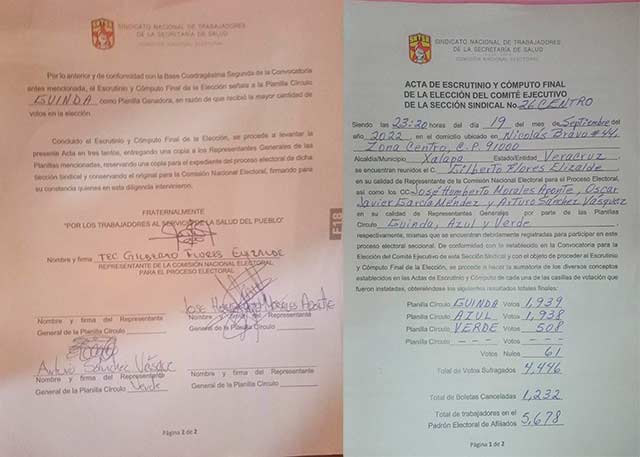 En el acta de escrutinio y cómputo final del Comité Ejecutivo de la Sección Sindical número 26 Centro se indica que la planilla guinda obtuvo mil 939 votos; la planilla azul mil 938 y la planilla verde 508 votos.