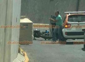 Un motociclista resultó lesionado la tarde de este lunes luego de que un tinaco fuera desprendido por los fuertes vientos y saliera proyectado desde una de las viviendas ubicadas a un costado de la lateral del puente “Macuiltépetl”, en la zona que conecta el bulevar Banderilla con la ciudad de Xalapa.