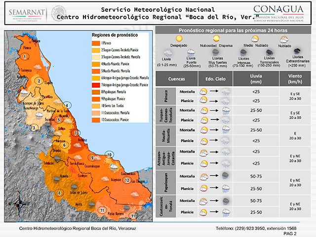 Se prevé que en el transcurso de este día, persistan las condiciones de cielo medio nublado a lo largo de la región de pronóstico, como consecuencia del persistente canal de baja presión sobre el suroeste del Golfo de México y los remanentes de la onda tropical número 19 ubicada sobre Oaxaca. Las lluvias serán vespertinas a nocturnas en zonas montañosa y nocturnas a matutinas en planicies y costas, esperando intervalos de chubascos fuertes (25 a 50 mm) con tormentas puntuales muy fuertes (50 a 75 mm) sobre las partes altas de las cuencas de los ríos Papaloapan, Coatzacoalcos y Tonalá; intervalos de chubascos (5.1 a 25 mm) con tormentas puntualmente fuertes (25 a 50 mm) especialmente sobre las cuencas de los ríos Cazones, Tecolutla y Nautla; mientras que en el resto de la región se prevén lluvias con intervalos de chubascos (5 a 25 mm).