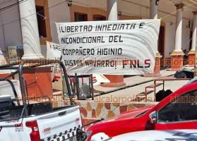Los militantes se apostaron en la plazoleta del Ayuntamiento de Chicontepec y exhibieron lonas, en una de las cuales exigen la libertad de Higinio Bustos Navarro, miembro de la organización y preso desde el 3 de mayo del año 2021 acusado de homicidio doloso cometido en 2008.