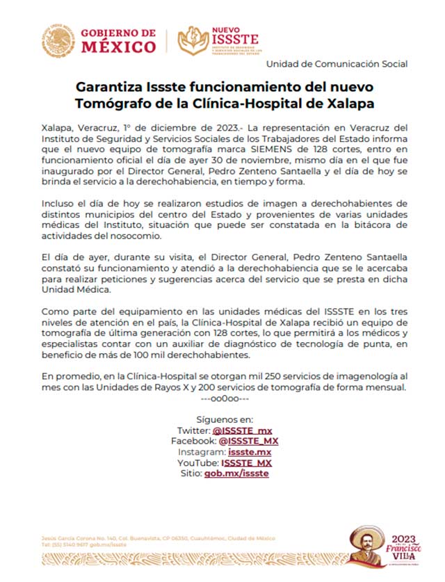“Como parte del equipamiento en las unidades médicas del ISSSTE en los tres niveles de atención en el país, la Clínica-Hospital de Xalapa recibió un equipo de tomografía de última generación con 128 cortes, lo que permitirá a los médicos y especialistas contar con un auxiliar de diagnóstico de tecnología de punta, en beneficio de más de 100 mil derechohabientes.