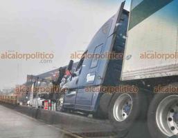 De acuerdo con los primeros reportes, el percance ocurrió presuntamente debido a la densa neblina que se registraba en las primeras horas del día, lo que habría impedido al conductor visualizar correctamente la separación de carriles entre el acceso al puente y el carril derecho, por lo que terminó montándose sobre el camellón divisorio y quedó inclinado, a punto de volcar.