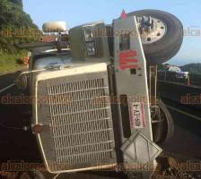 Un tráiler terminó volcado sobre la carretera Xalapa-Veracruz, en el municipio de Emiliano Zapata; según el conductor, dormitaba y por ello perdió el control del vehículo.