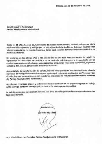 Por ello, enfatizó que ante esta falta de transformación del partido, el cierre de puertas en muchas actividades y la nula capacidad de diálogo de los líderes para lograr seguir trabajando por México, por Veracruz y por Orizaba, es que con carácter de irrevocable presentó su renuncia definitiva como militante del Partido Revolucionario Institucional.